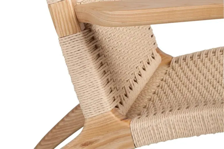 Rear leg, back, and seat are sculpted from a single piece of solid oak in a seamless Y-shape with 22° recline. Combined with handwoven cord, it delivers enduring stability and timeless visual elegance.