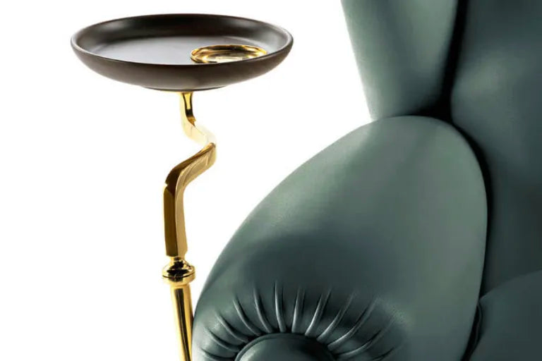 A bronze swivel saucer plate built into the armrest — your personal spot for a drink, book, or ashtray. Stylish, smart, and always within reach.